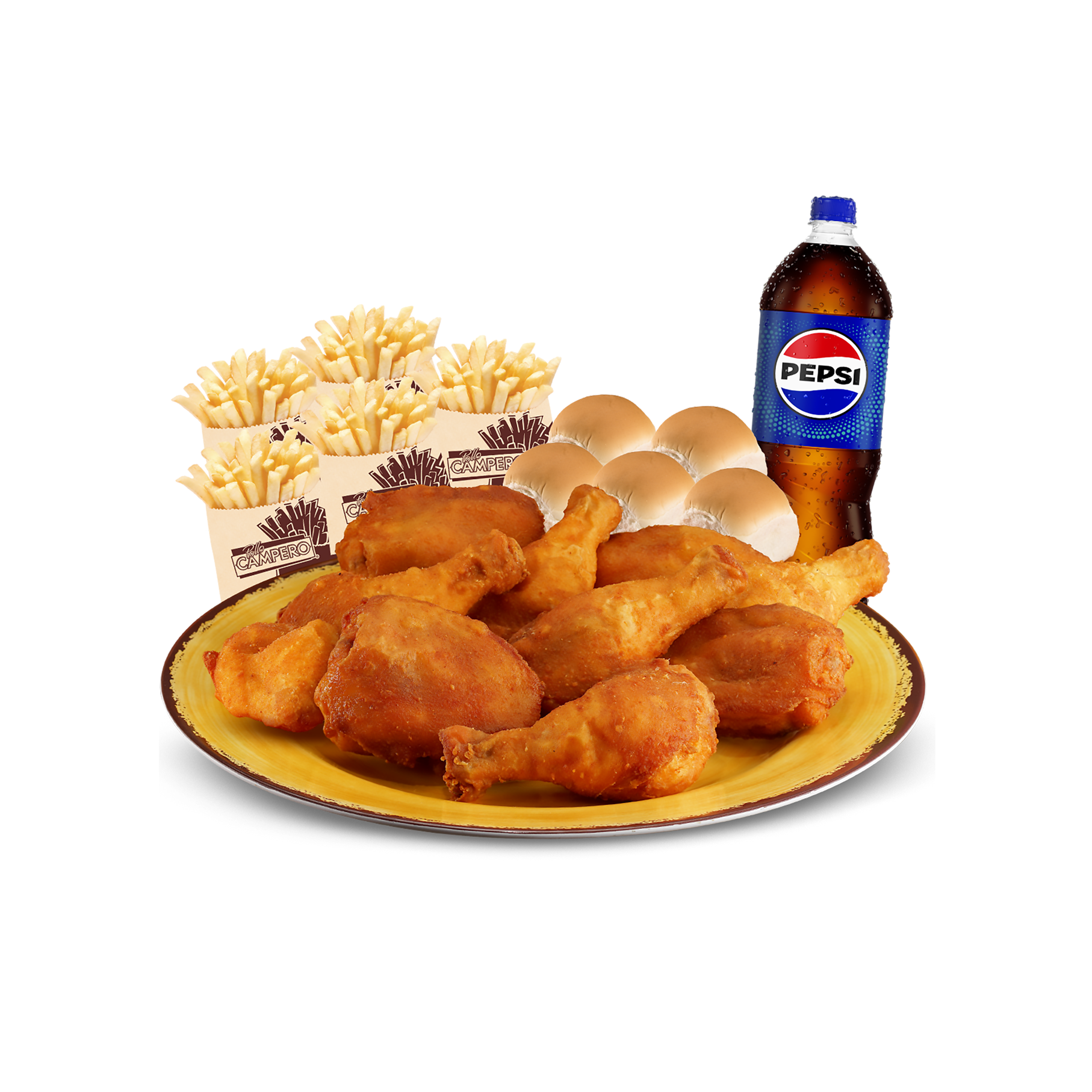 Combo familiar por Q 169. Incluye 10 Piezas de pollo + 5 papas pequeñas + 5 panes bollos + bebida familiar